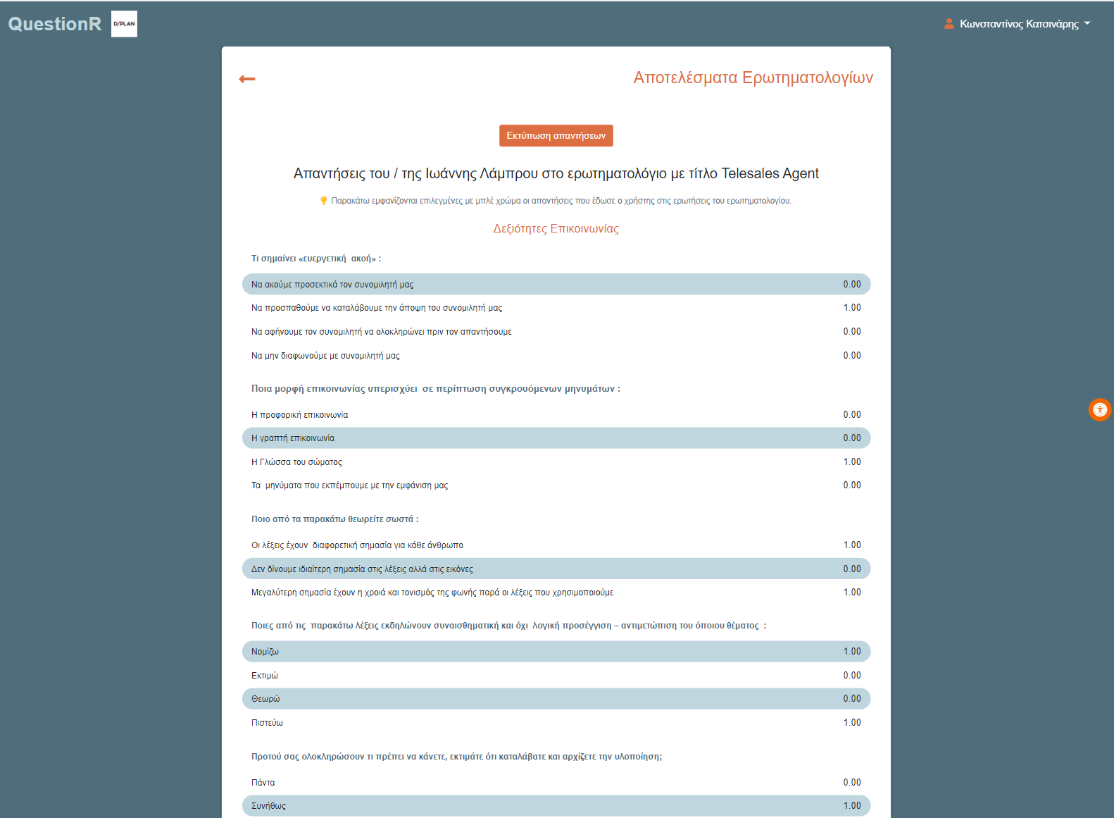 Με την απάντηση των ερωτηματολογίων απευθείας από τους υποψηφίους, έχετε άμεσα αποτελέσματα σε έναν πίνακα όπου μπορεί να γίνει εξαγωγή και σε Excel ως συνολική εικόνα με ποσοστό επιτυχίας του κάθε υποψύφιου ανα κατηγορία.