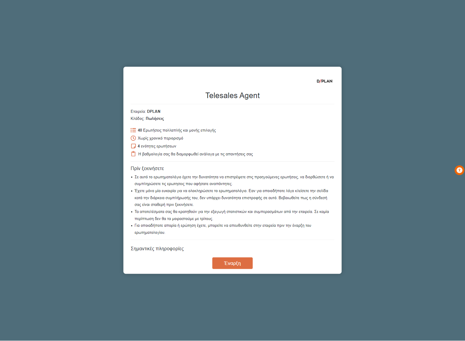 Ανοίγοντας το εκάστοτε ερωτηματολόγιο ο υποψήφιος έχει μια γενική εικόνα με πληροφορίες για το ερωτηματολόγιο που πρόκειται να συμπληρώσει.